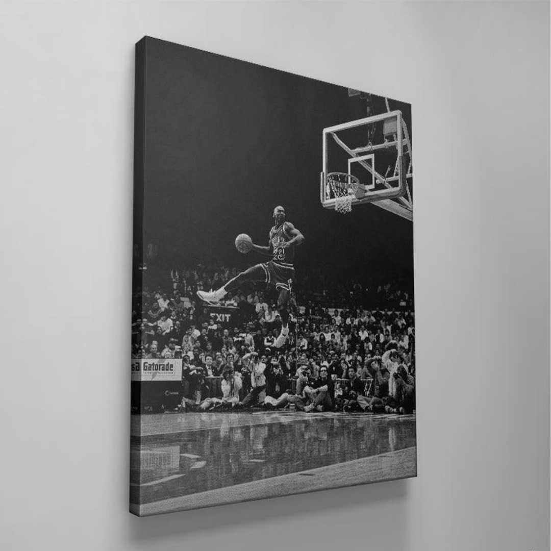 Michael Jordan attempts a dunk during the 1988 Slam Dunk Contest on February 6, 1988 at Chicago Stadium in Chicago, Illinois.